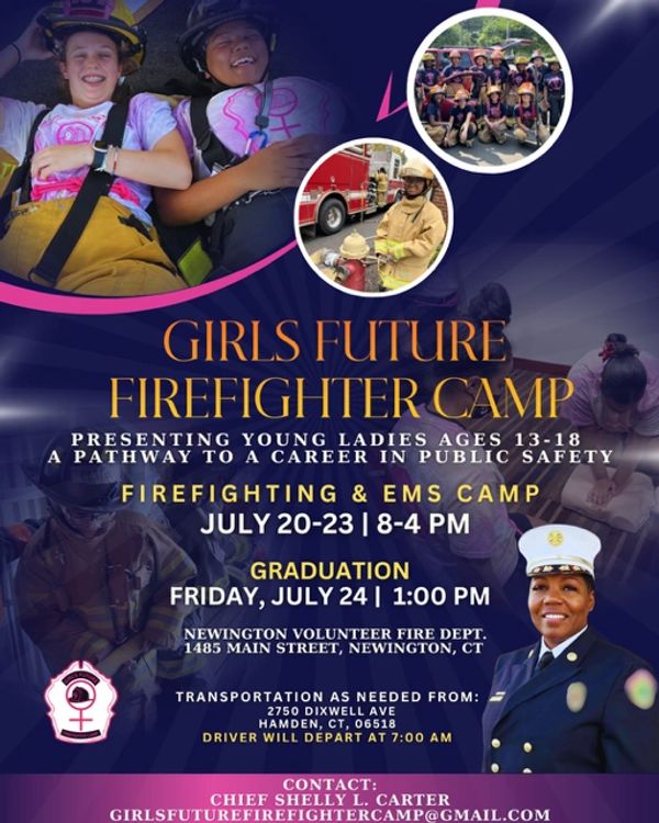 Girl's Future Firefighter Camp (GFFC) is a FREE camp for girls, ages 13-18. GFFC is an established 503c nonprofit training program that focuses on empowering young ladies to think outside the box as they envision their futures. GFFC opens minds and contributes to the social and economic mobility of young women through authentic firefighter and emergency services training and experiences in preparation for